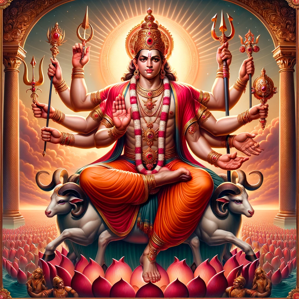 Clothed in red, with a red body and four arms, born of Earth, seated upon a Ram, holding a trident, spear, and mace in his hands, with a precious coral in the crown of his head, bestowing blessings with a gesture of his hand, may the Divine Lord Mars send us his mercy for all eternity.